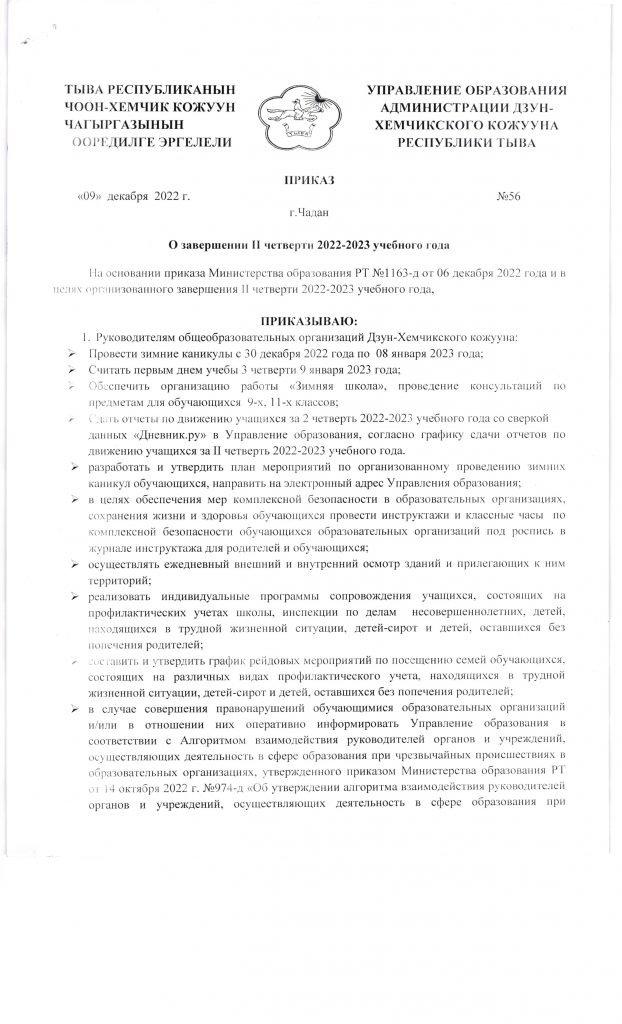 «Ура-а каникулы!» Распоряжение 589-р от 24 октября 2022г. по ВДЦСкачать Межвед.план Мы вместе мы единыСкачать Приказ Минобра РТ Об утверждении Алгоритма по ЧПСкачать Приказ Минобра по организации ВДЦ в период осенних каникулСкачать Приказ Минобра от 20.10.2022г №998-д По осенним каникуламСкачать приказ УО от 24.10.2022 №29Скачать приказ школы от 25.10.2022 №35Скачать план осенних каникул 2022г.Скачать Метод рекомендации МОиН РТ новый год 2022Скачать приказ УО Приказ школы о завершении 2 четвертиСкачать план зимних каникул 2022гСкачать план зимних каникул 2024г.Скачать