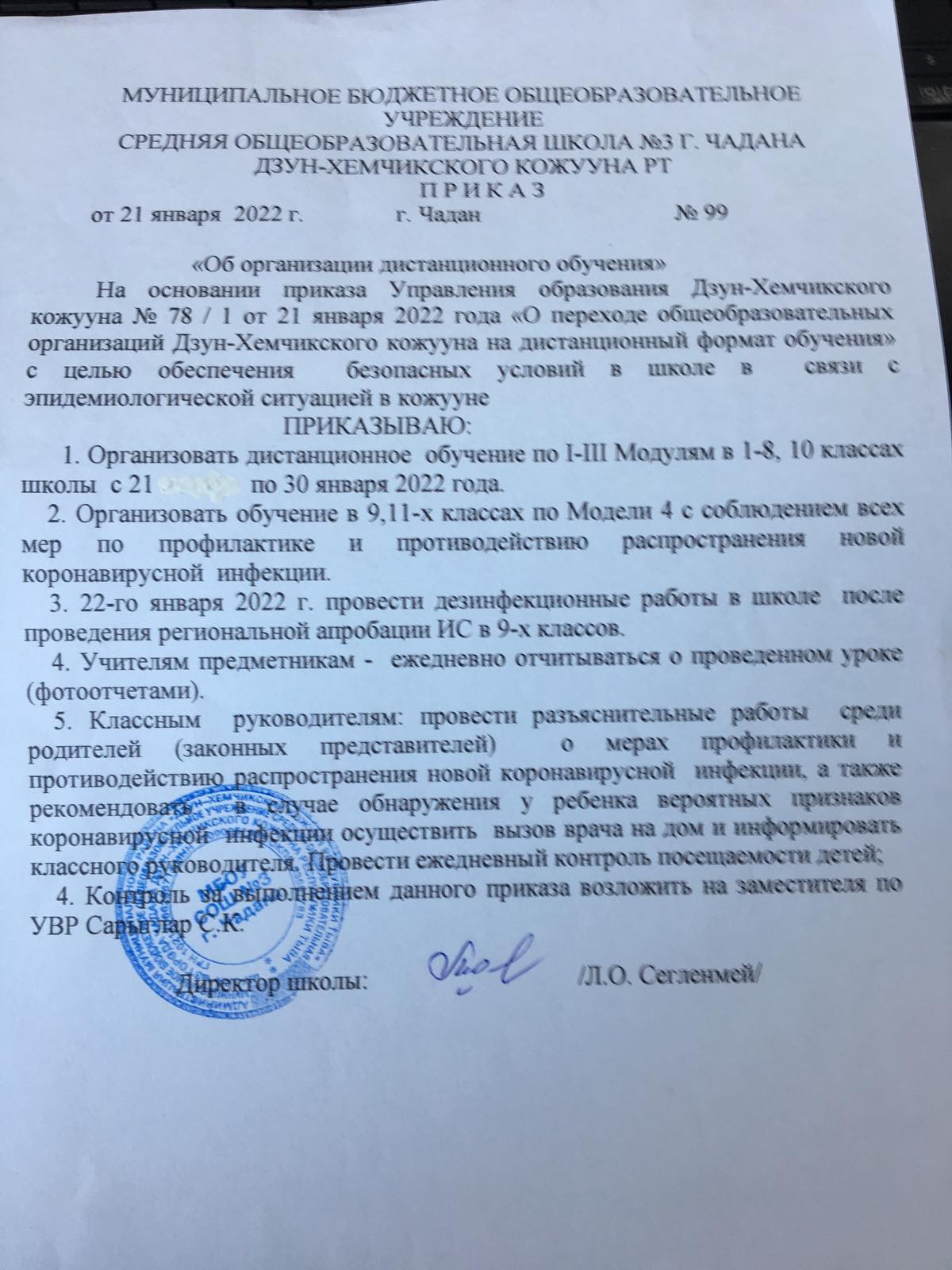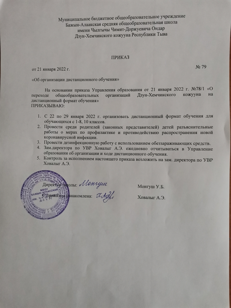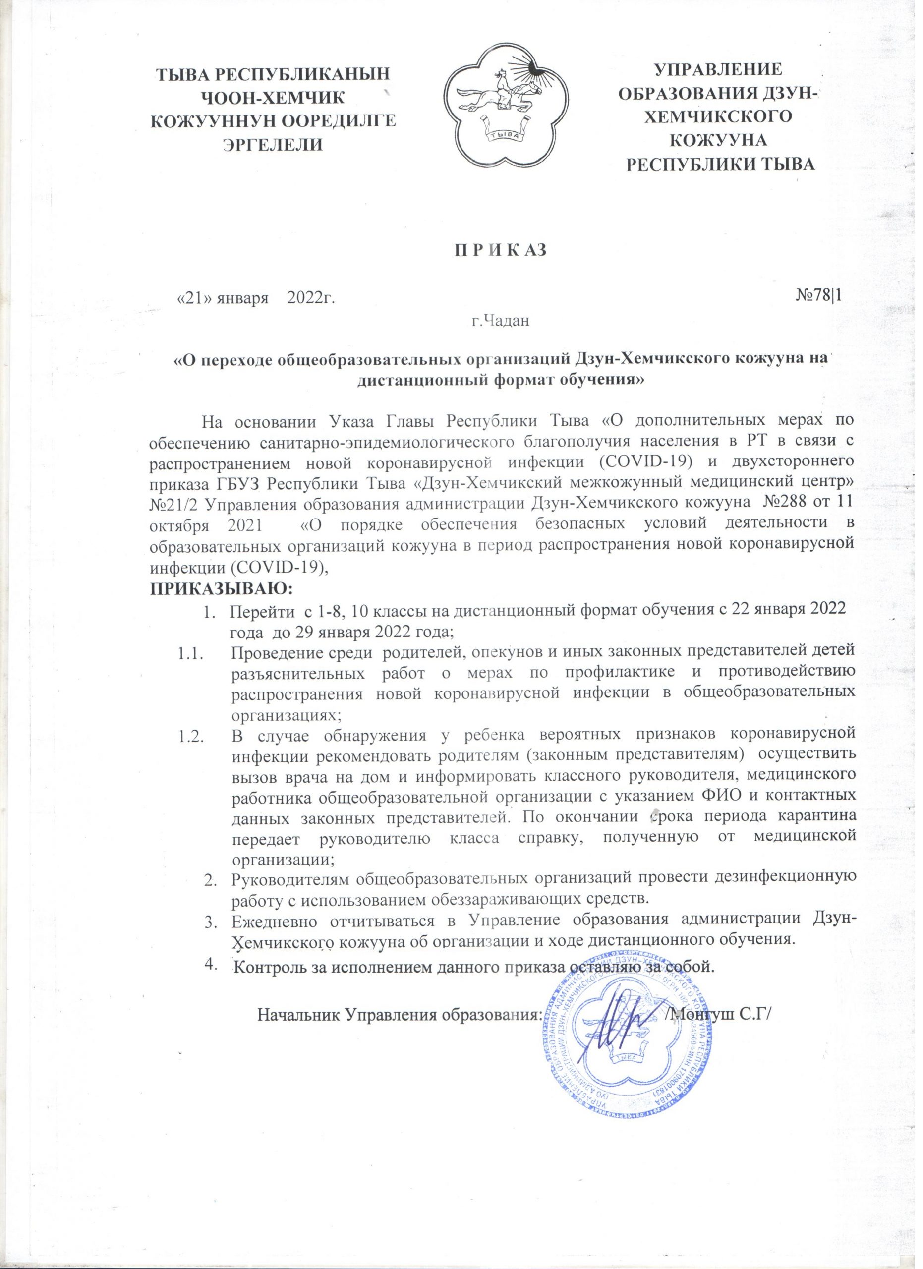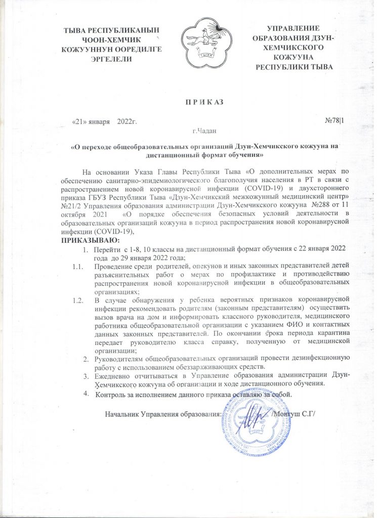 Приказ Управления образования о переходе ОО кожууна на дистанционный формат обучения